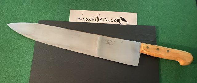 Descripción: Fabricado en España. Cuchillo de chef Cuinsa . Hoja de acero inoxidable , mango de madera de boj . Cuchillo no apto para golpes, solo fuerza de la mano. Longitud hoja 36,2 cm Longitud total 49 cm Alto de hoja 6,2 cm