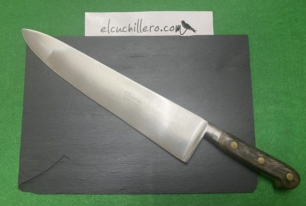 Descripción: Cuchillo de chef forjado 108 girodias . Hoja de acero inoxidable , mango de madera de encina. Cuchillo no apto para golpes, solo fuerza de la mano. Longitud hoja 30,4 cm Longitud total 43,2 cm Alto de hoja 6 cm