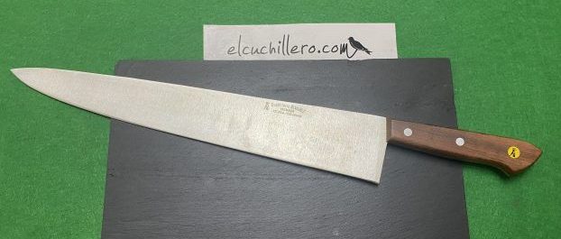 Descripción: Fabricado en España. Cuchillo de chef (Hijos de Pedro Ramón) . Hoja de acero inoxidable , mango de madera de bubinga . Cuchillo no apto para golpes, solo fuerza de la mano. Longitud hoja 33,5 cm Longitud total 46,5 cm Alto de hoja 5,6 cm