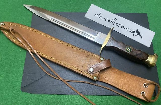 Descripción: Cuchillo de montaña Muela con funda de piel. Hoja de acero inoxidable , mango madera con guarda de latón . Longitud hoja 25,5 cm Longitud total 38 cm.