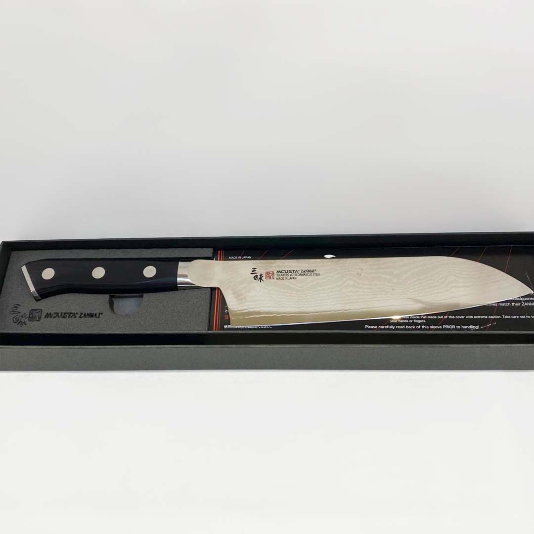 El cuchillo de cocina Mcusta, forma Santoku, tiene una hoja de acero inoxidable VG10 damasco, fabricada con 32 capas. Su hoja con una longitud de 18 cm. Mango fabricado en Pakka negra. Longitud total 31 cm