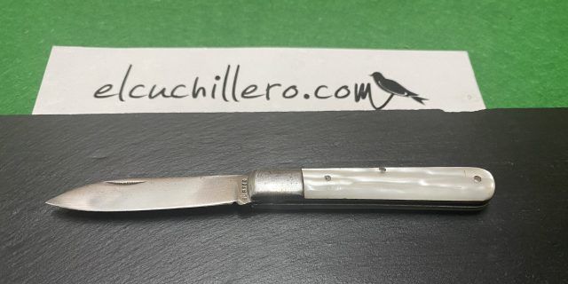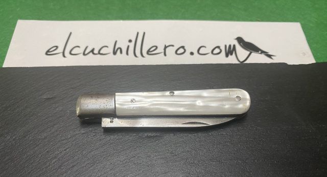 Hoja acero carbono, empuñadura nácar y acero. Cierre pistón