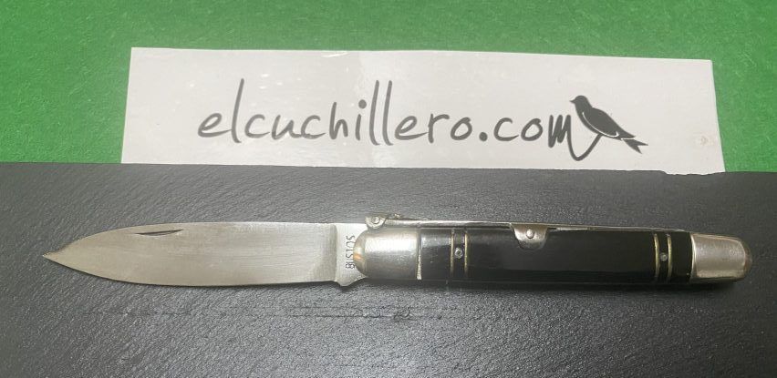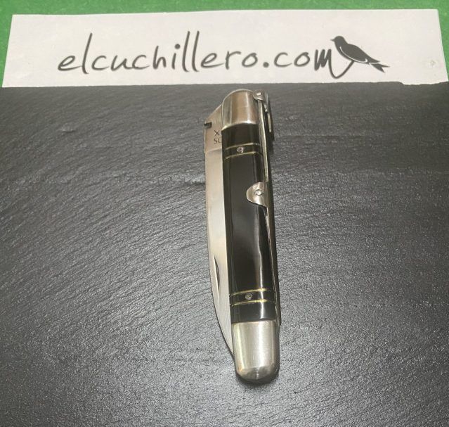 Hoja acero inoxidable, cachas asta con cintillos. Sistema de cierre Palanquilla.