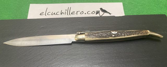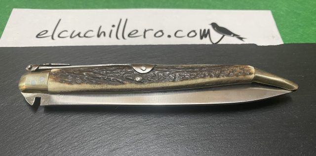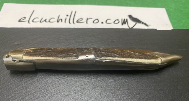 Hoja acero inoxidable, cachas cuerno de ciervo. Sistema de cierre Palanquilla