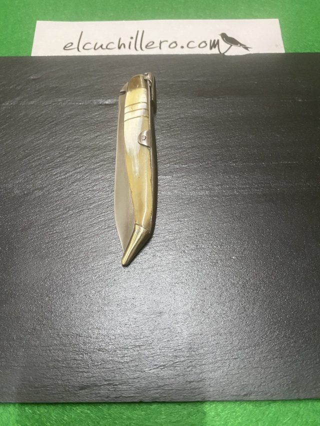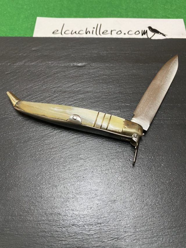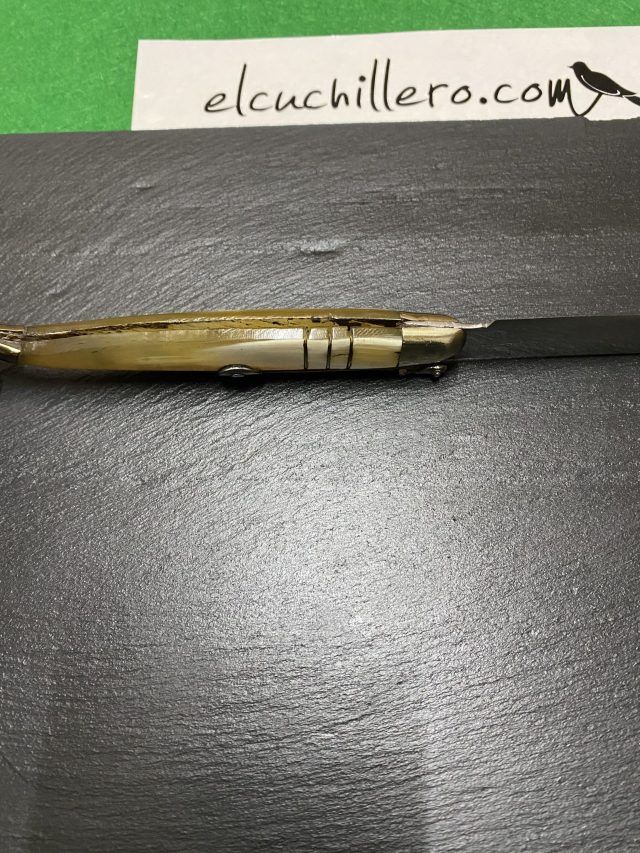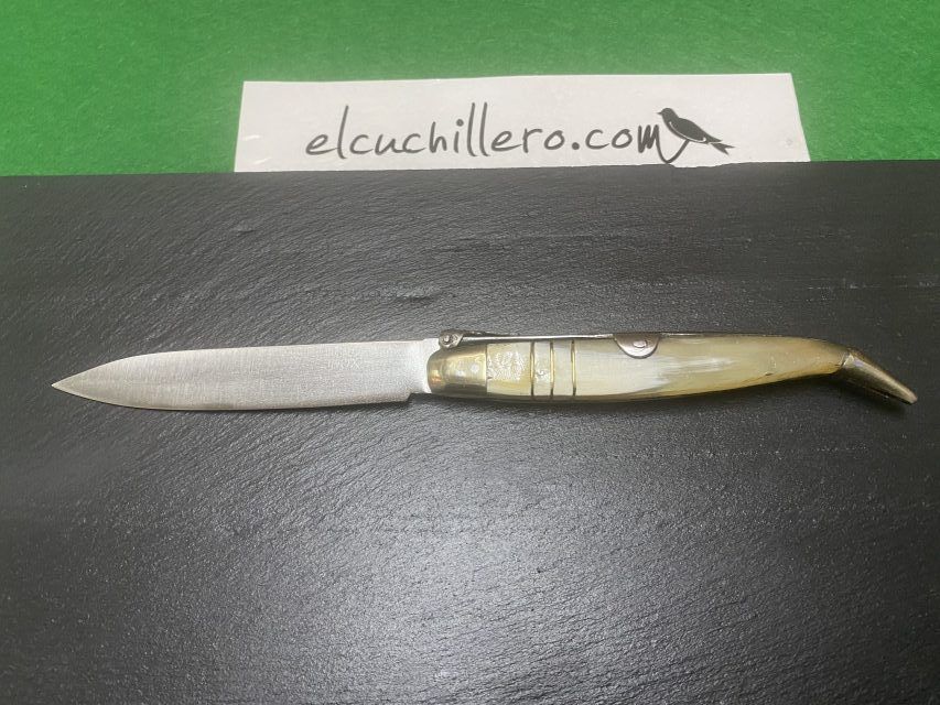 Hoja acero inoxidable, cachas asta de toro y cintillos. Sin forros. Sistema de cierre Palanquilla.