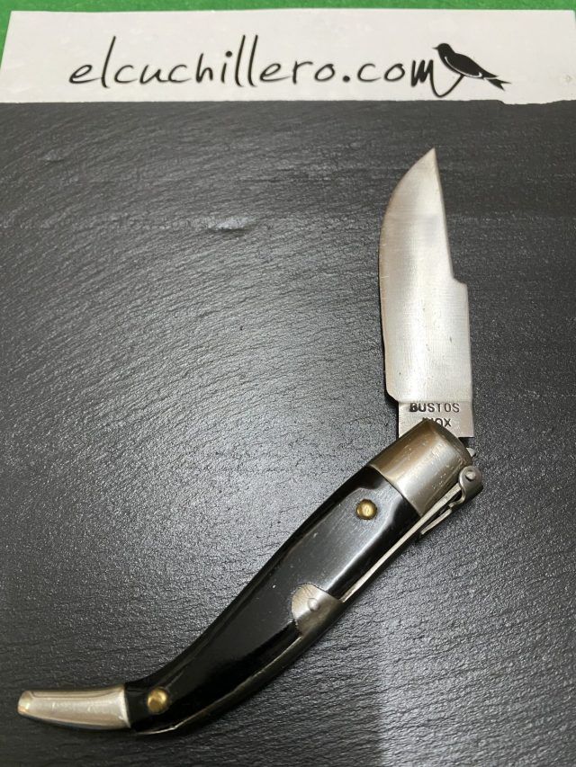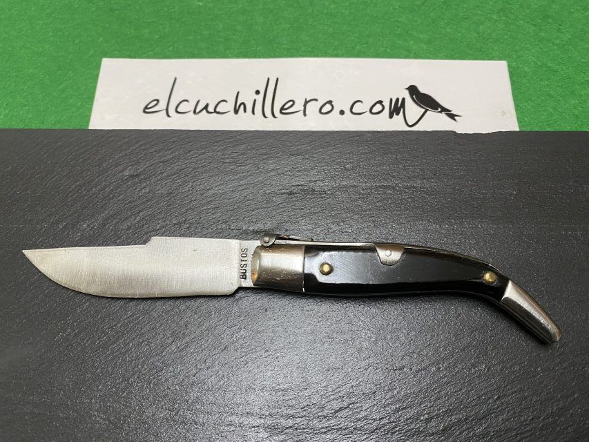 Hoja acero carbono, cachas de pasta negra. Sistema de cierre Palanquilla.