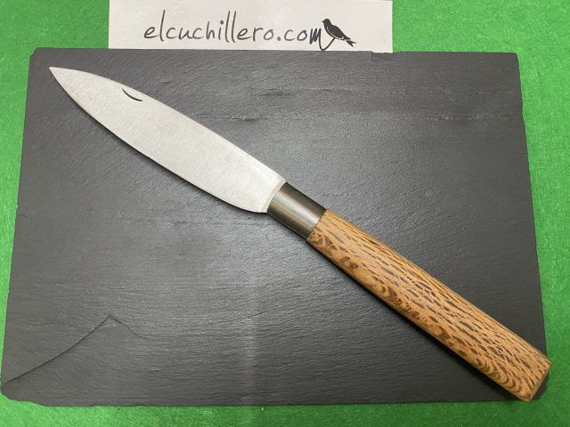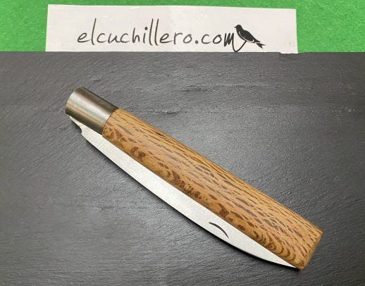 Hoja acero carbono, empuñadura madera de encina. Casquillo romano de fricción. Sin seguro.