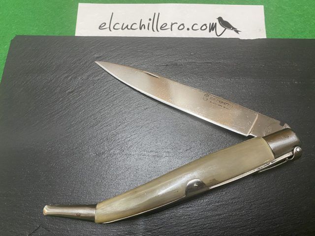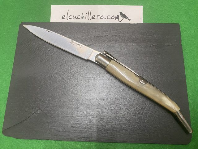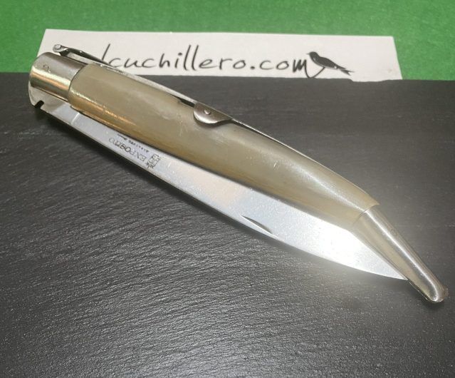 DESCRIPCIÓN: Navaja Expósito punta espada, serranilla. Hoja acero inoxidable, cachas asta de toro. Sistema de cierre palanquilla. LH 16 cm LT 36 cm