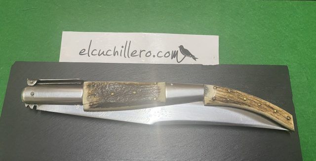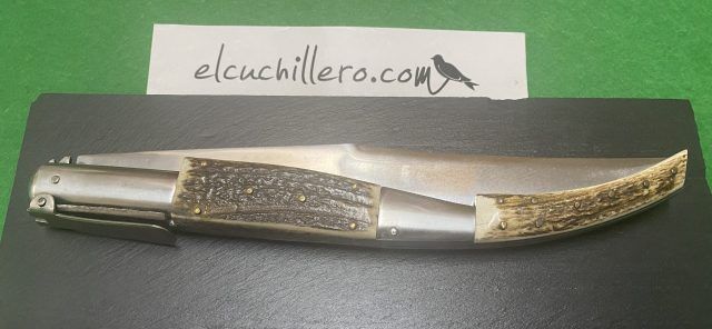 Hoja acero inoxidable, empuñadura cuerno ciervo. Sistema cierre Palanquilla.