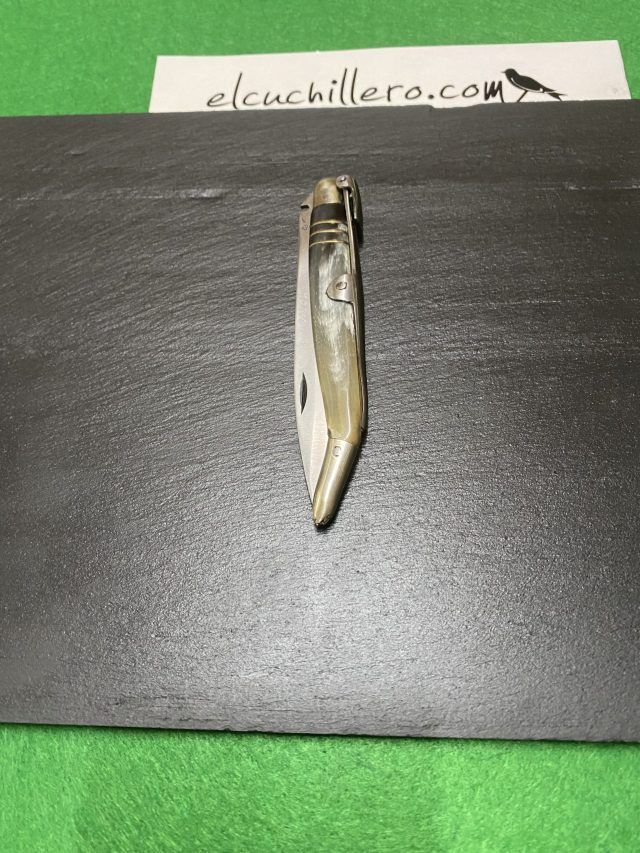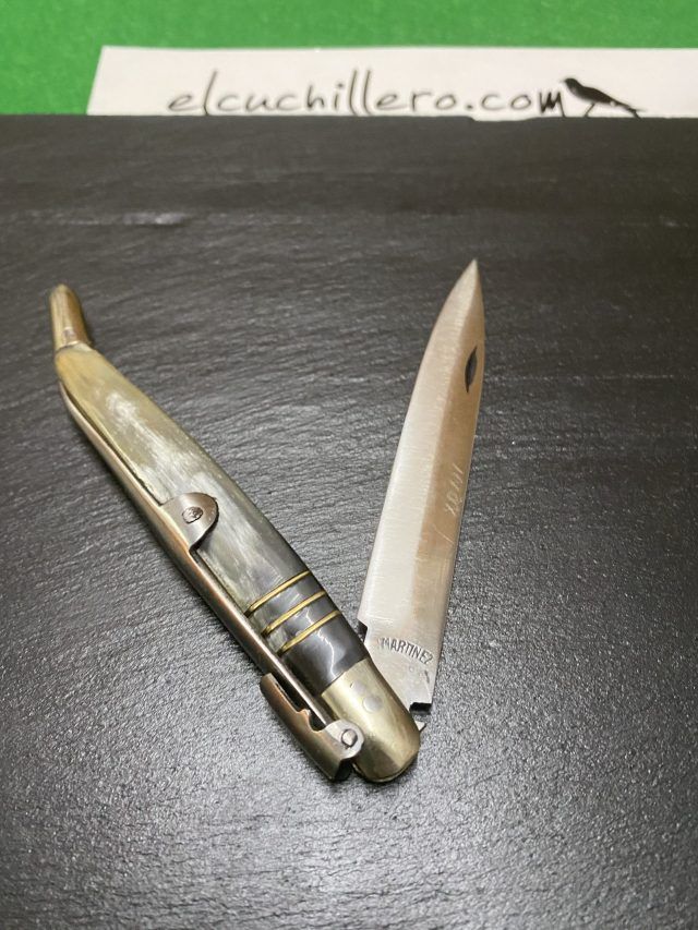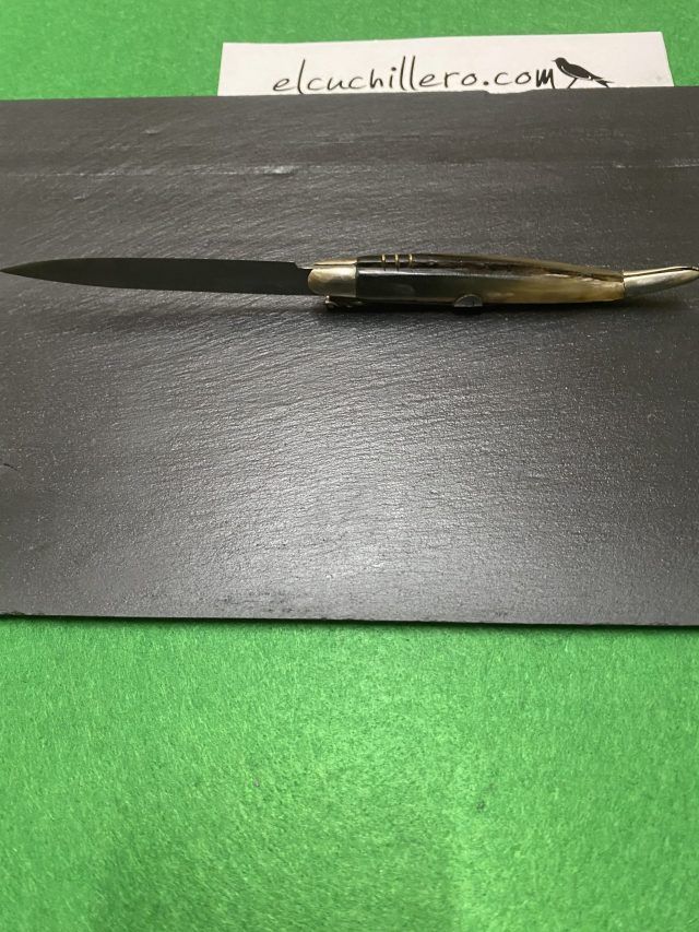 Hoja acero inoxidable, cachas asta de toro con cintillos. Sin forros. Sistema de cierre Palanquilla.