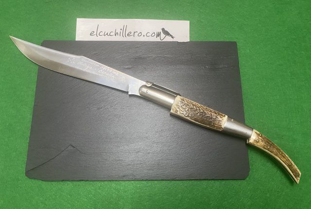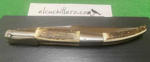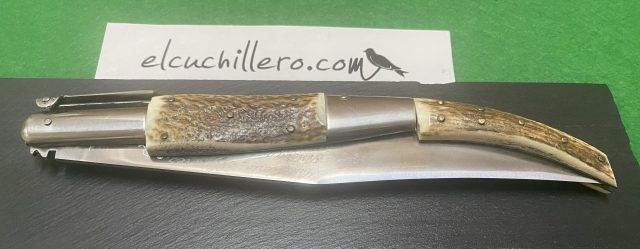 Hoja acero inoxidable, empuñadura cuerno de ciervo. Sistema de cierre Palanquilla.
