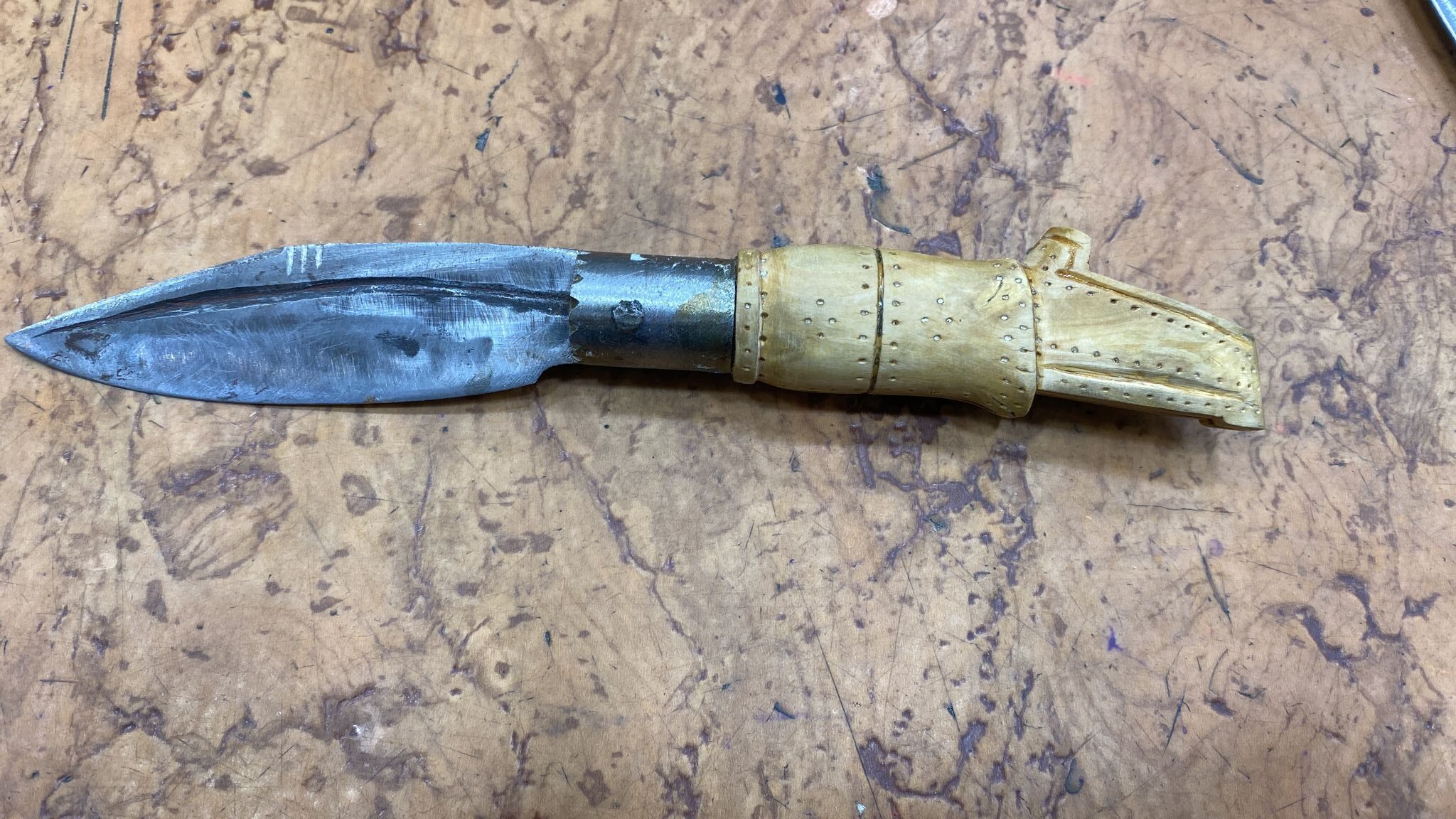 Hoja fabricada de hoja de guadaña y mango de brezo blanco.