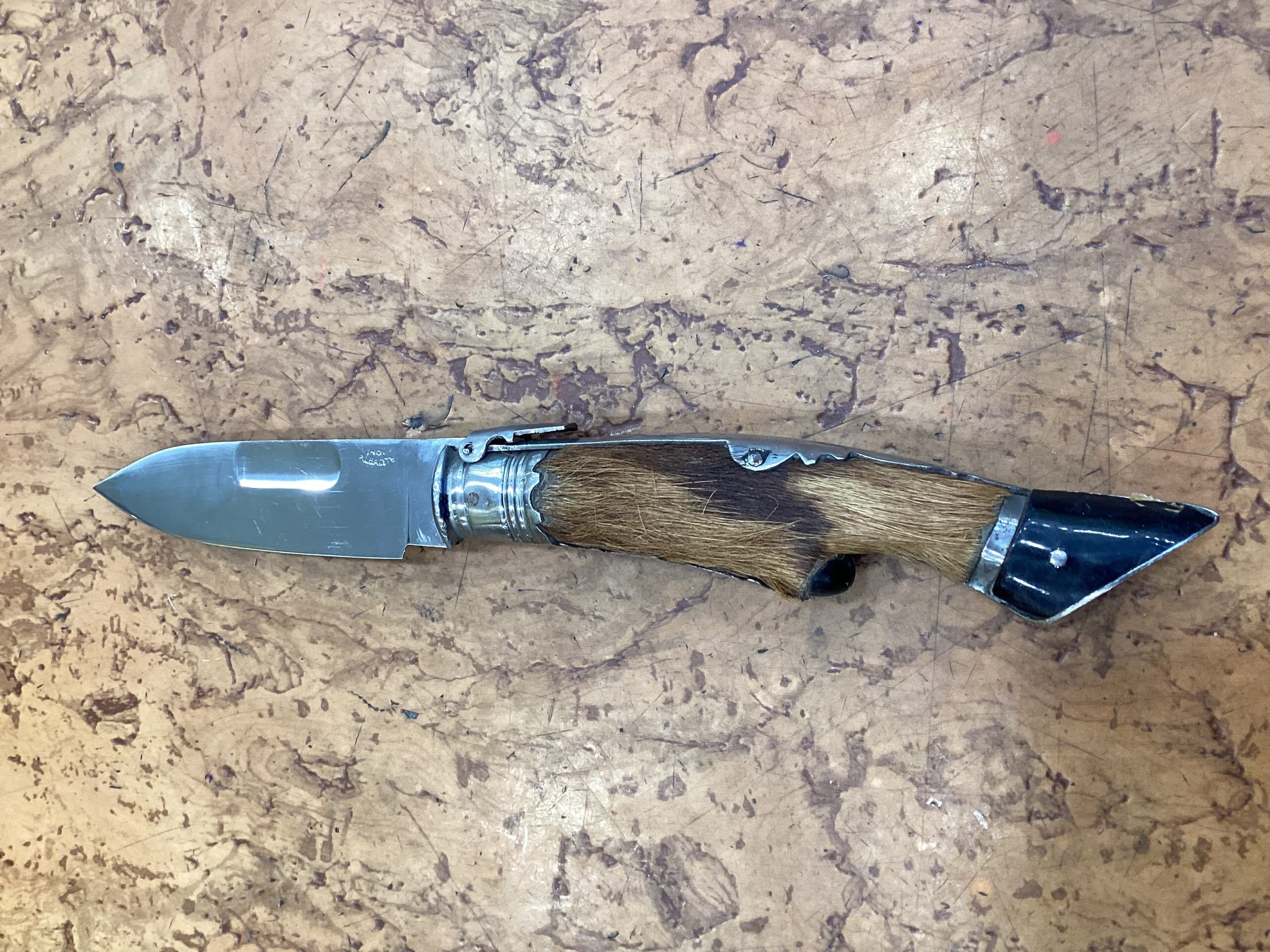 Antigua navaja de pata realizada por artesanos de Albacete.Hoja acero inoxidable, empuñadura pelo de burro. Cierre de palanquilla.