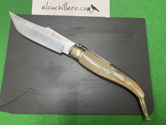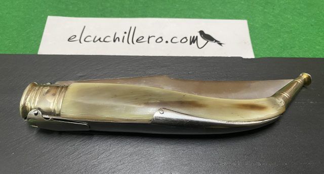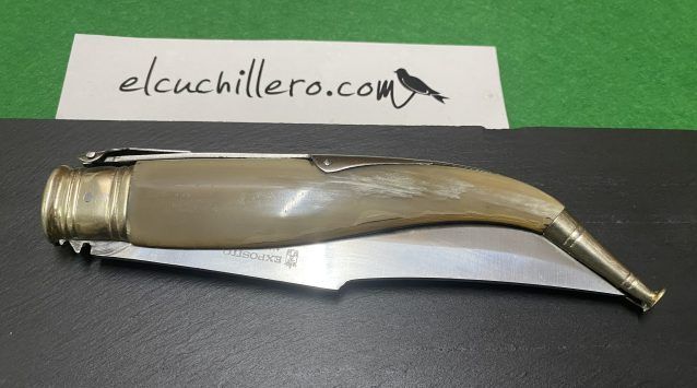 Empuñadura esta hecha con asta de toro, engarzada con alpaca