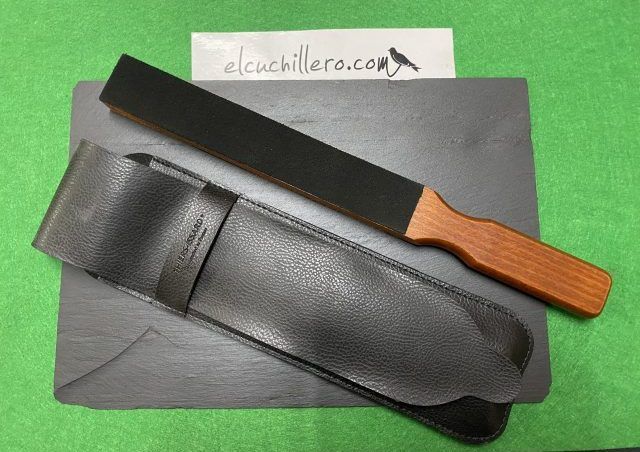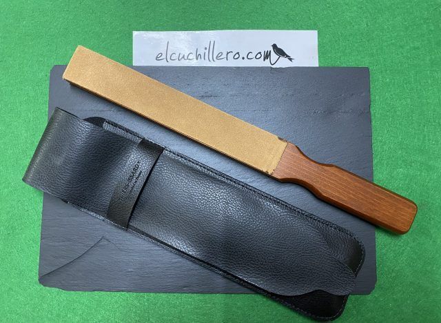 Suavizador-asentador de hojas de navajas de afeitar especial con bastidor o base en madera y dos caras recubiertas de cuero y piel de distinta finura o gramaje para un completo afilado de la navaja barbera.
