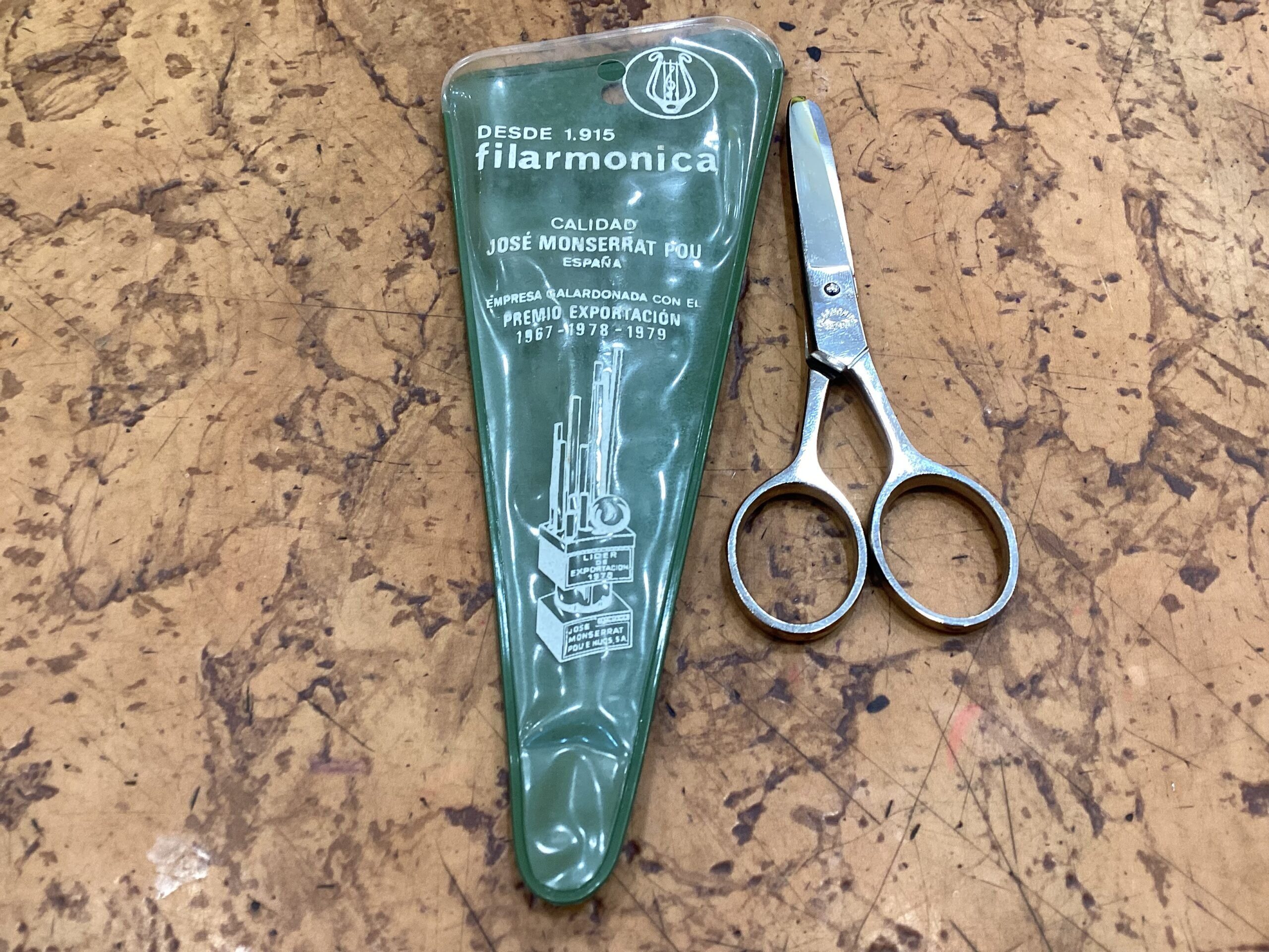 Tijera fabricada por José Monserrat Pou. Articulo de colección. Hoja acero carbono, con doble temple.Funda original. Longitud de hoja: 5,8 cm Longitud total: 12,9 cm